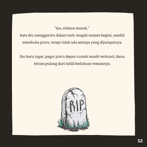 "Iya, silakan masuk," kata ibu menggerutu dalam hati; tengah malam begini, sambil membuka pintu, tetapi tidak ada sesiapa yang dijumpainya. Ibu baru ingat, pagar pintu depan rumah masih terkunci, Banu belum pulang dari tahlil kedukaan temannya. 52