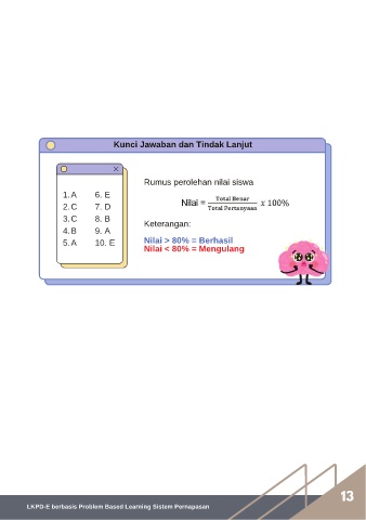 Kunci Jawaban dan Tindak Lanjut Rumus perolehan nilai siswa 1. A 6. E 2. C 7. D 3. C 8. B Keterangan: 4. B 9. A 5. A 10. E Nilai > 80% = Berhasil Nilai < 80% = Mengulang 13 LKPD-E berbasis Problem Based Learning Sistem Pernapasan
