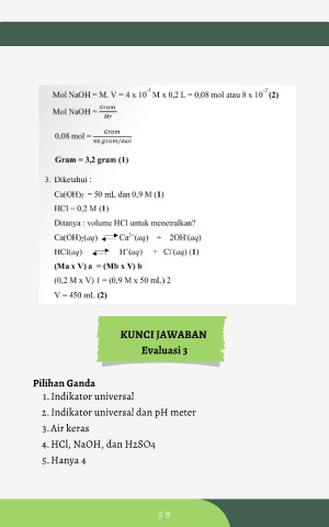 KUNCI JAWABAN Evaluasi 3 Pilihan Ganda 1. Indikator universal 2. Indikator universal dan pH meter 3. Air keras 4. HCl, NaOH, dan H2SO4 5. Hanya 4 5 1 5 8