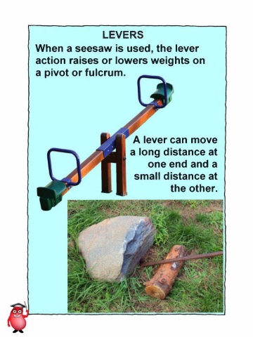 LEVERS When a seesaw is used, the lever action raises or lowers weights on a pivot or fulcrum. A lever can move a long distance at one end and a small distance at the other.