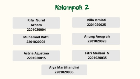 Rifa Nurul Rilla Ismiati Arham 2201020025 2201020004 Muhamad Raffi Anung Anugrah 2201020005 2201020028 Astria Agustina Fitri Meilani N 2201020015 2201020035 Alya Martihandini 2201020036