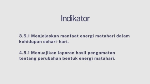 Indikator 3.5.1 Menjelaskan manfaat energi matahari dalam kehidupan sehari-hari. 4.5.1 Menuajikan laporan hasil pengamatan tentang perubahan bentuk energi matahari.