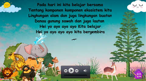 Pada hari ini kita belajar bersama Tentang komponen komponen ekosistem kita Lingkungan alam dan juga lingkungan buatan Danau gunung sawah dan juga lautan Hei yo ayo ayo ayo Kita belajar Hei yo ayo ayo ayo kita bergembira