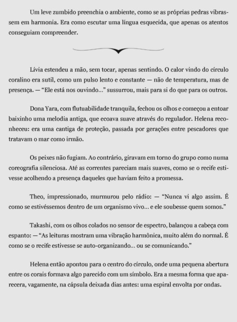 coreografia silenciosa. Até as correntes pareciam mais suaves, como se o recife esti-