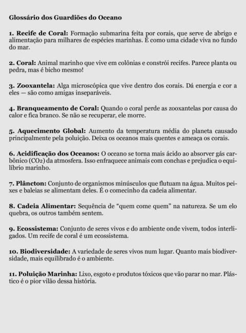 1. Recife de Coral: Formação submarina feita por corais, que serve de abrigo e