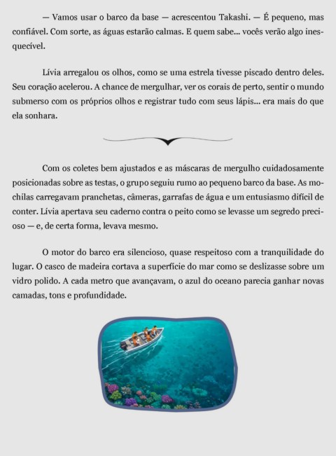 — Vamos usar o barco da base — acrescentou Takashi. — É pequeno, mas
