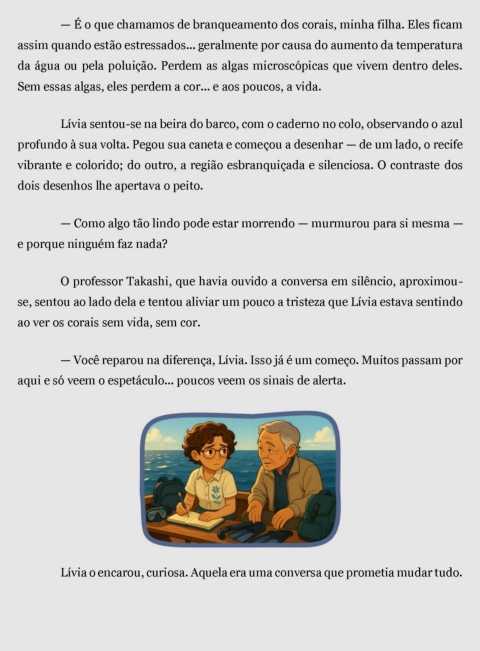 Lívia sentou-se na beira do barco, com o caderno no colo, observando o azul