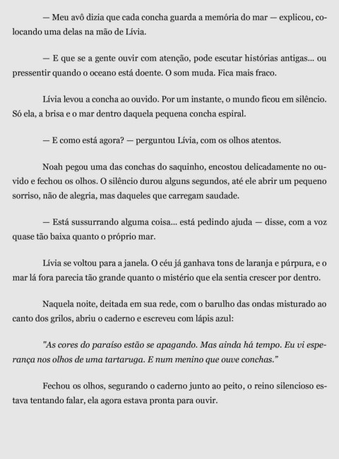 Lívia levou a concha ao ouvido. Por um instante, o mundo ficou em silêncio.