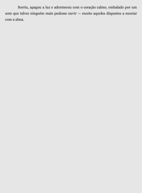 Sorriu, apagou a luz e adormeceu com o coração calmo, embalado por um som que talvez ninguém mais pudesse ouvir — exceto aqueles dispostos a escutar com a alma.