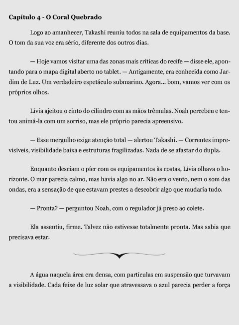 — Esse mergulho exige atenção total — alertou Takashi. — Correntes impre-
