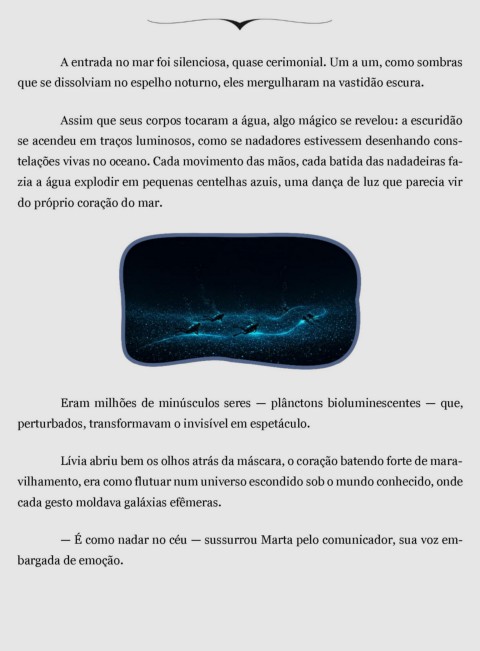 telações vivas no oceano. Cada movimento das mãos, cada batida das nadadeiras fa-