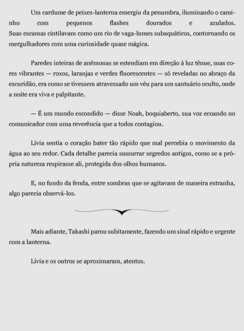 Suas escamas cintilavam como um rio de vaga-lumes subaquáticos, contornando os