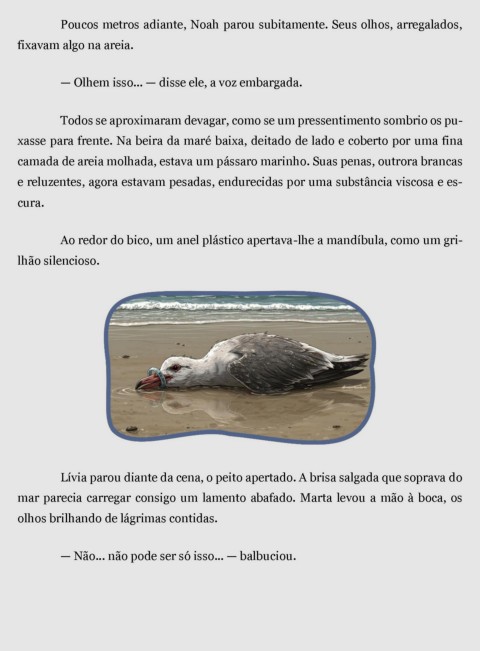 camada de areia molhada, estava um pássaro marinho. Suas penas, outrora brancas