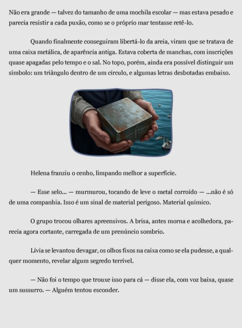 uma caixa metálica, de aparência antiga. Estava coberta de manchas, com inscrições