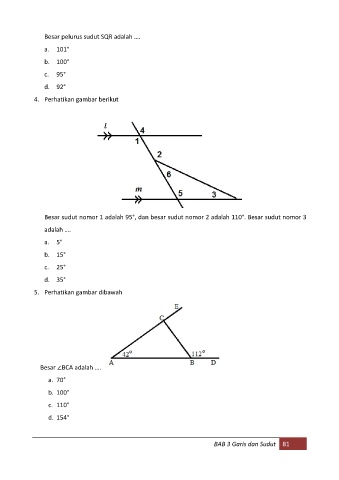 Besar sudut nomor 1 adalah 95°, dan besar sudut nomor 2 adalah 110°. Besar sudut nomor 3