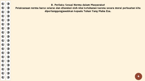 B. Perilaku Sesuai Norma dalam Masyarakat Pelaksanaan norma harus selaras dan dilandasi oleh nilai ketuhanan karena secara moral perbuatan kita dipertanggungjawabkan kepada Tuhan Yang Maha Esa. 4