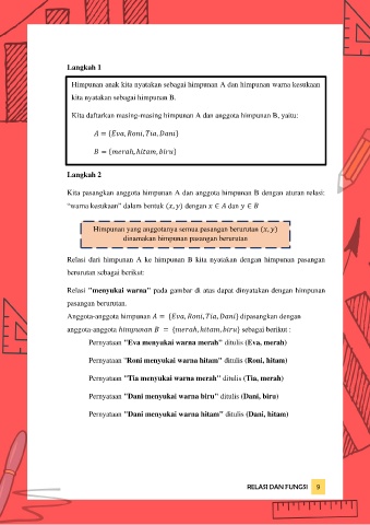 Relasi "menyukai warna" pada gambar di atas dapat dinyatakan dengan himpunan