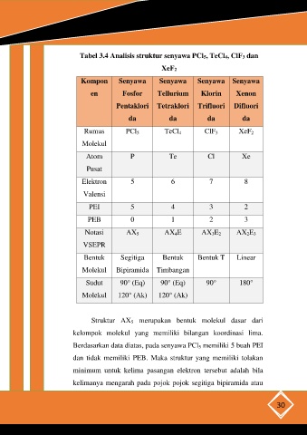 Tabel 3.4 Analisis struktur senyawa PCl5, TeCl4, ClF3 dan