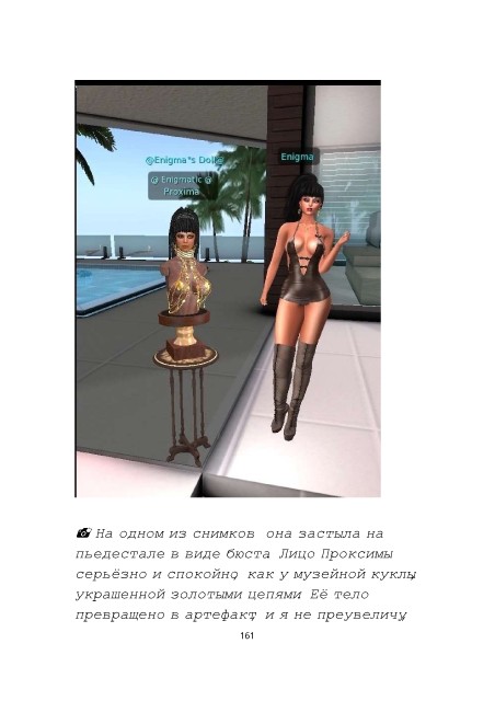 На одном из снимков она застыла на пьедестале в виде бюста. Лицо Проксимы серьёзно и спокойно, как у музейной куклы, украшенной золотыми цепями. Её тело превращено в артефакт, и я не преувеличу, 161