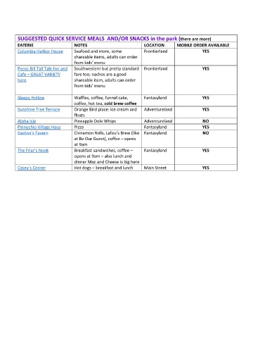 SUGGESTED QUICK SERVICE MEALS AND/OR SNACKS in the park (there are more)