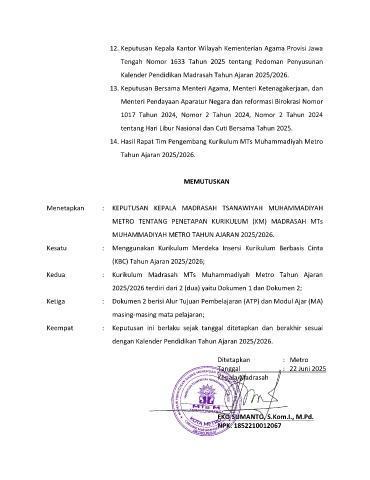 METRO TENTANG PENETAPAN KURIKULUM (KM) MADRASAH MTs