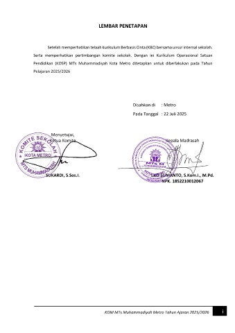 Pendidikan (KOSP) MTs Muhammadiyah Kota Metro ditetapkan untuk diberlakukan pada Tahun