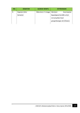 NO. KEGIATAN ALOKASI WAKTU KETERANGAN 9. Kegiatan Akhir Maksimum 1 minggu Memberi kesempatan Semester kepadapeserta didik untuk menampilkan hasil pengembangan diri (Ekskul). KOM MTs Muhammadiyah Metro Tahun Ajaran 2025/2026 37