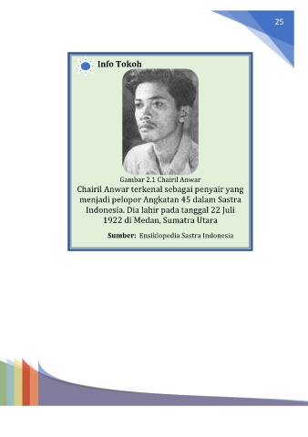 25 Info Tokoh Gambar 2.1 Chairil Anwar Chairil Anwar terkenal sebagai penyair yang menjadi pelopor Angkatan 45 dalam Sastra Indonesia. Dia lahir pada tanggal 22 Juli 1922 di Medan, Sumatra Utara Sumber: Ensiklopedia Sastra Indonesia