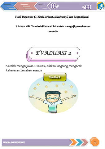 Yuuk Berempat C (Kritis, kreatif, kolaboratif, dan komunikatif) Silakan klik Tombol di bawah ini untuk menguji pemahaman ananda EVALUASI 2 USAHA DAN ENERGI 72