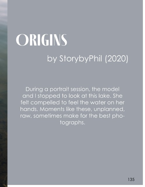 Origins by StorybyPhil (2020) During a portrait session, the model and I stopped to look at this lake. She felt compelled to feel the water on her hands. Moments like these, unplanned, raw, sometimes make for the best pho- tographs. 135