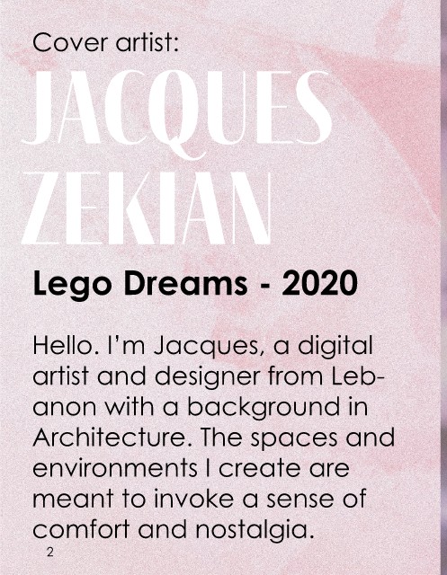Cover artist: Jacques zekian Lego Dreams - 2020 Hello. I’m Jacques, a digital artist and designer from Leb- anon with a background in Architecture. The spaces and environments I create are meant to invoke a sense of comfort and nostalgia. 2