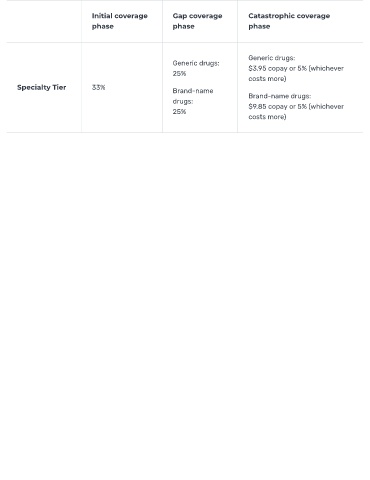 Initial coverage Gap coverage Catastrophic coverage phase phase phase Generic drugs: Generic drugs: 25% $3.95 copay or 5% (whichever costs more) Specialty Tier 33% Brand-name Brand-name drugs: drugs: $9.85 copay or 5% (whichever 25% costs more)