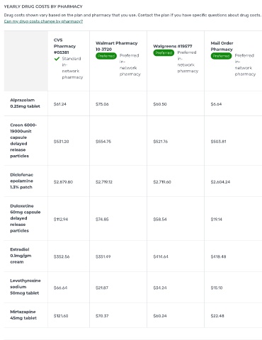 Drug costs shown vary based on the plan and pharmacy that you use. Contact the plan if you have speci c questions about drug costs.