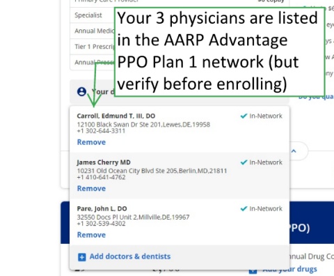 Your 3 physicians are listed in the AARP Advantage PPO Plan 1 network (but verify before enrolling)