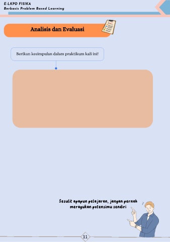E-LKPD FISIKA Berbasis Problem Based Learning Analisis dan Evaluasi Berikan kesimpulan dalam praktikum kali ini! Sesulit apapun pelajaran, jangan pernah meragukan potensimu sendiri 11