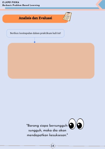 E-LKPD FISIKA Berbasis Problem Based Learning Analisis dan Evaluasi Berikan kesimpulan dalam praktikum kali ini! "Barang siapa bersungguh- sungguh, maka dia akan mendapatkan kesuksesan." 14