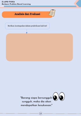 E-LKPD FISIKA Berbasis Problem Based Learning Analisis dan Evaluasi Berikan kesimpulan dalam praktikum kali ini! "Barang siapa bersungguh- sungguh, maka dia akan mendapatkan kesuksesan." 13
