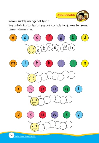 Ayo Berlatih Kamu sudah mengenal huruf. Susunlah kartu huruf sesuai contoh kerjakan bersama teman-temanmu. e a c f g b d a b c e f g h m i h k j l n r s p o q t v x u w z y 14 Buku Siswa Kelas SD/M