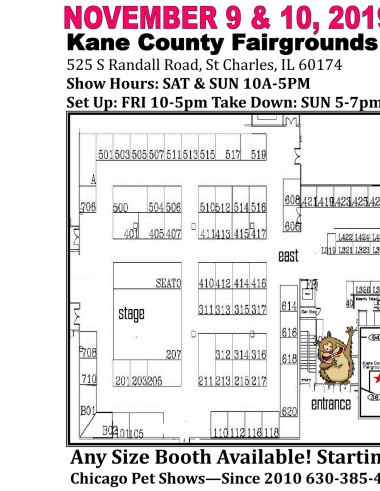 Kane County Fairgrounds 525 S Randall Road, St Charles, IL 60174 Show Hours: SAT & SUN 10A-5PM Set Up: FRI 10-5pm Take Down: SUN 5-7pm Any Size Booth Available! Starting at 10x10 Chicago Pet Shows—Since 2010 630-385-4000 ww.ChicagoPetShow.com