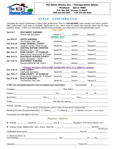 Complete this Space Confirmation, listing booth preferences. Fax it to 630-385-4006. Upon receipt, we’ll call to confirm.