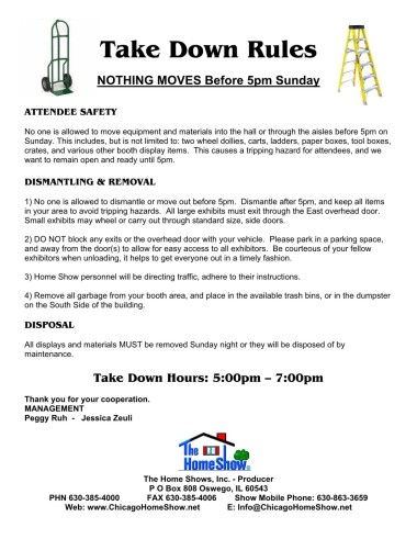 in your area to avoid tripping hazards. All large exhibits must exit through the East overhead door.
