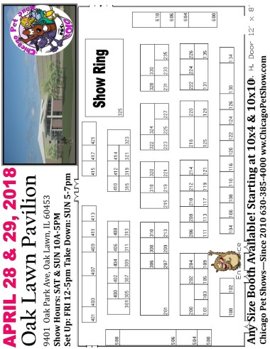 Oak Lawn Pavilion 9401 Oak Park Ave, Oak Lawn, IL 60453 Show Hours: SAT & SUN 10A-5PM Set Up: FRI 12-5pm Take Down: SUN 5-7pm Any Size Booth Available! Starting at 10x4 & 10x10 Chicago Pet Shows—Since 2010 630-385-4000 ww.ChicagoPetShow.com