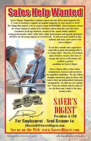 37 years is looking to expand our popular magazine in your market in 2019. The Tampa Bay market is #2 in coupon usage NATIONWIDE. Smart business owners are using coupons to attract new customers and to keep the ones they have. Consumers in all age brackets, income levels, senior adults, families,