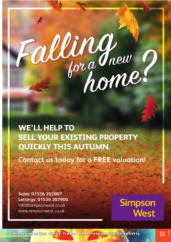 WE’LL HELP TO SELL YOUR EXISTING PROPERTY QUICKLY THIS AUTUMN. Contact us today for a FREE valuation! Sales: 01536 202007 Lettings: 01536 207900 info@simpsonwest.co.uk www.simpsonwest.co.uk Please mention Corby Trader when responding to adverts 33