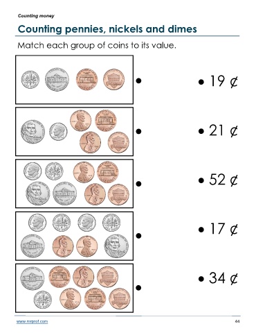 Counting money Counting pennies, nickels and dimes Match each group of coins to its value. 19 ¢ 21 ¢ 52 ¢ 17 ¢ 34 ¢ www.mrprof.com 44