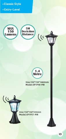 • Classic Style • Entry-Level MAX 5M 150 Dectction Lumens Distance 1.4 Metre Size:150*150*1460mm Model:SP1P48-PIR Size:150*150*335mm Model:SP1P51-PIR 10