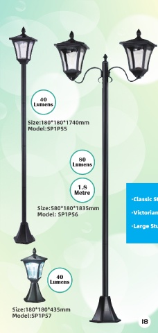 40 Lumens Size:180*180*1740mm Model:SP1P55 80 Lumens 1.8 Metre ·Classic Style. Size:580*180*1835mm Model: SP1P56 ·Victorian Poles. ·Large Sturdy Base. 40 Lumens Size:180*180*435mm Model:SP1P57 18