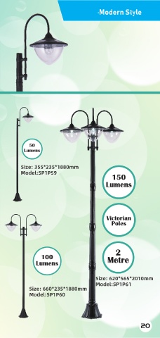 ·Modern Style 50 Lumens Size: 355*235*1880mm Model:SP1P59 150 Lumens Victorian Poles 2 100 Metre Lumens Size: 620*565*2010mm Model:SP1P61 Size: 660*235*1880mm Model:SP1P60 20