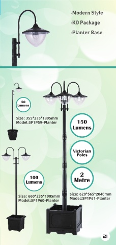 ·Modern Style ·KD Package ·Planter Base 50 Lumens Size: 355*235*1895mm Model:SP1P59-Planter 150 Lumens Victorian Poles 2 100 Lumens Metre Size: 620*565*2040mm Size: 660*235*1905mm Model:SP1P61-Planter Model:SP1P60-Planter 21
