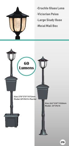 ·Crackle Glass Lens ·Victorian Poles ·Large Study Base ·Metal Mail Box 60 Lumens Size:370*370*1975mm Model:SP1P674-Planter Size:265*230*1950mm Model: SP1P674 26